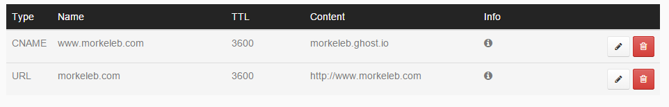 Pointing www.morkeleb.com to Ghost's infrastructure was more troublesome that I thought. The old blog was hosted at one.com. One.com's DNS configuration couldn't handle the alias setup required for pointing the root of morkeleb.com to Ghost.io.